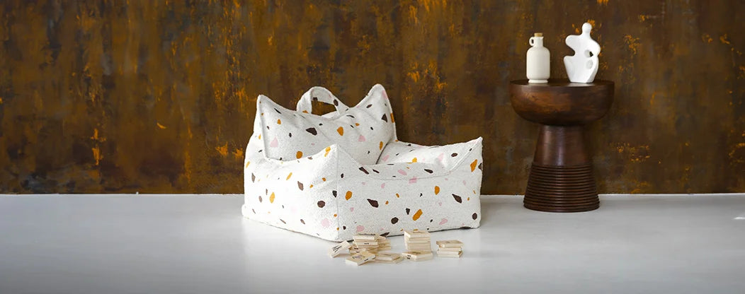 Discover the Terrazzo Collection – where timeless design meets playful comfort. Inspired by the classic terrazzo pattern and reimagined for modern family interiors, this collection brings a touch of design heritage into your home. Crafted from a custom blend of boucle and chenille, our kids beanbags and kids chairs combine style, durability, and everyday comfort. OEKO-TEX® and GRS® certified, each piece is hypoallergenic, easy to clean, and built to last. With its subtle textures and soft hues, the Terrazzo Collection elevates any children’s room – sparking imagination and nurturing a love for design from an early age. A perfect choice for parents who value interior design and want kids furniture that blends beauty with function.