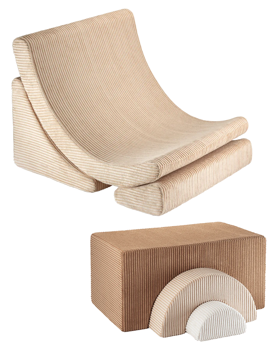 The Moon Builders Set combines sculptural design with open ended play through two pieces that feel as refined as they are functional. It brings together the award winning Brown Sugar Moon Chair and the Toffee Rainbow Playset, both handmade in Latvia from our OEKO TEX certified corduroy.